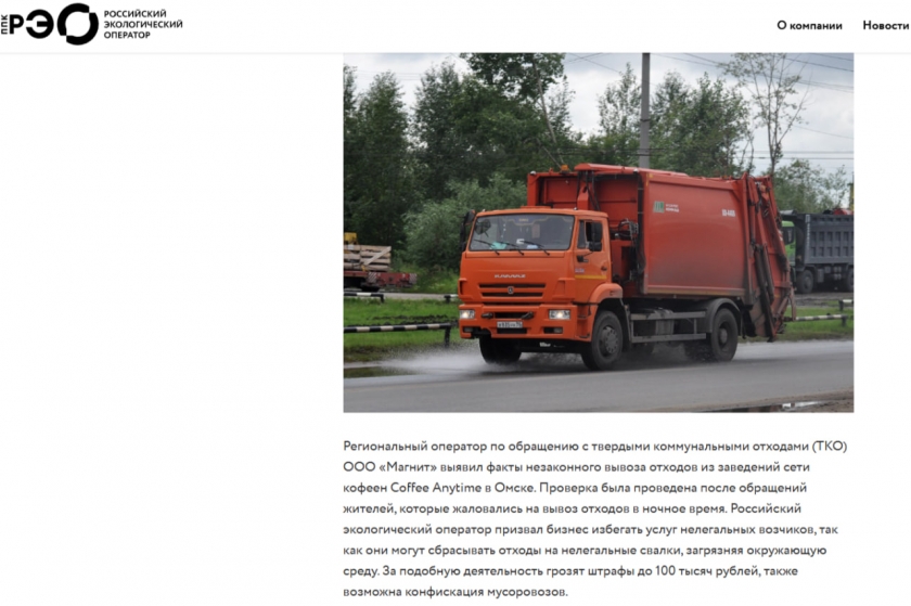 Региональный оператор по обращению с твердыми коммунальными отходами (ТКО) ООО «Магнит» выявил факты незаконного вывоза отходов из заведений сети кофеен Coffee Anytime в Омске. Проверка была проведена после обращений жителей, которые жаловались на вывоз отходов в ночное время. Российский экологический оператор призвал бизнес избегать услуг нелегальных возчиков, так как они могут сбрасывать отходы на нелегальные свалки, загрязняя окружающую среду. За подобную деятельность грозят штрафы до 100 тысяч рублей, также возможна конфискация мусоровозов, с«Деятельность так называемых „серых“ перевозчиков отходов несет прямую угрозу экологической и санитарной безопасности, приводит к образованию стихийных свалок и наносит ущерб бюджету региона. Регоператор передал материалы проверки, включая фото- и видеодоказательства, в надзорные органы. Призываем все организации и бизнес не пользоваться услугами нелегальных перевозчиков и работать только с региональным оператором», — отметили в пресс-службе Российского экологического оператора.